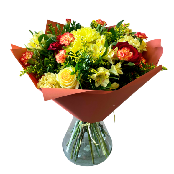 Särav ja elujõuline lillekimp, kus kollased lilled saavad erilise sära oranži ja punase aktsentidega.